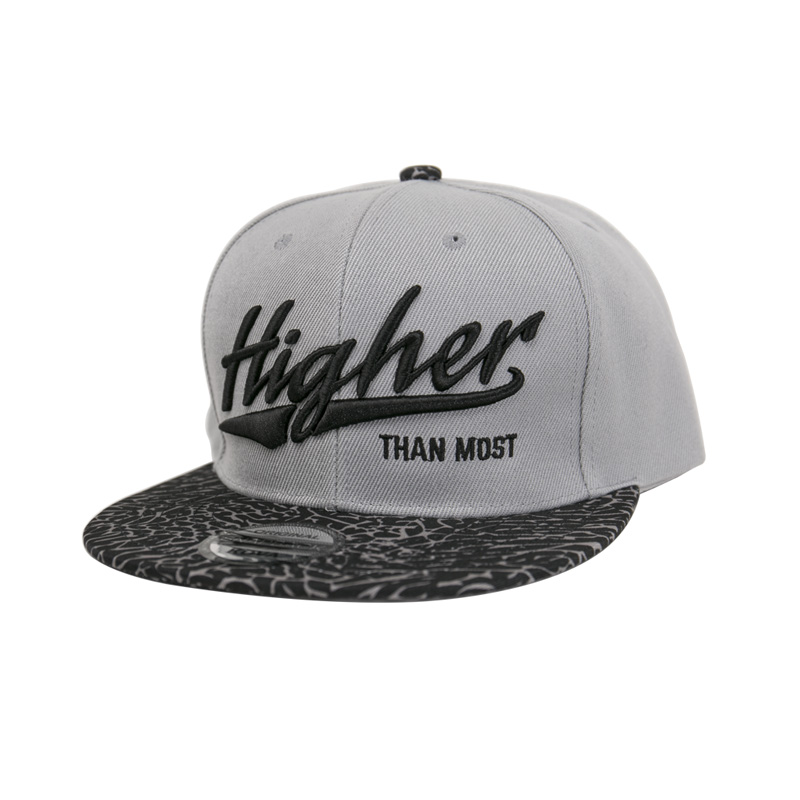 Black 3d embroidered logo on a grey cap with dark cement printed brim.